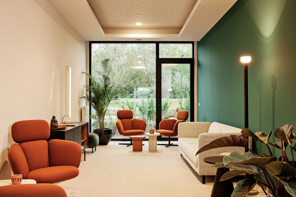 Les couleurs vert/beige/brun/ocre soutiennent la cohérence et la complémentarité de l’ensemble. Dans la bibliothèque, le vert favorise la relaxation et la concentration tandis qu’un cuir grainé de qualité crée une sensation immédiate de confort et de luxe lors de l’assise. Rien n’est laissé au hasard, les matières, couleurs et sensations sont orchestrées selon une approche résolument globale. Une modularité potentielle des éléments y évite même un agencement figé. Les concepteurs mettent un point d’honneur à produire des créations qui racontent une histoire sous la forme d’une expérience d’espaces où il fait bon vivre – pour les clients – et agréablement travailler – pour le personnel. En somme, des lieux de caractère, chaleureux, conviviaux et invitants.